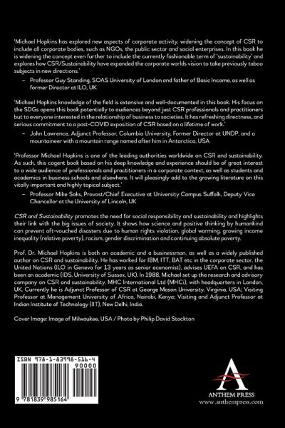 CSR and Sustainability promotes the need for social responsibility and sustainability and highlights their link with the big issues of society. It shows how science and positive thinking by humankind can prevent oft-vouched disasters due to human rights violation, global warming, growing income inequality (relative poverty), racism, gender discrimination and continuing absolute poverty.