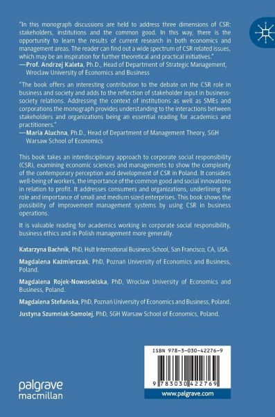 Part I: Common good and CSR - ideological perspective.- Economic success or social well-being.- The need for relational ethics in the axiological-linguistic image of the world of Respect Index companies.- Profit and common good in Polish private limited non-profit companies.- Identification of social irresponsibility manifestations in the social responsibility management system in a small enterprise - importance, place and conditions.- Justyna Szumniak-Samolej, Corporate social innovations on the Polish market.- Part II: CSR in Poland - institutional perspective.- Social Responsibility at Polish Universities - Based on The Example of WSB University in Wroclaw.- Social Responsibility of Universities and Colleges-the View of SGH Stakeholders.- Engaging stakeholders as the essence of social responsibility of small and medium sized enterprises.- Social responsibility of a small training and consulting enterprise.- Implementation and Measurement of Socially Responsible Activities in Enterprises of the SME Sector Based on The Example of the Company Melinski Minuth.- Part III: CSR in relations with key stakeholders - employees and consumers perspective.- Employer branding and Corporate Social Responsibility.- CSR level versus employees dismissal.- Integration of the employee pension programs with CSR.- Age Management in Selected Enterprises Operating in the Opole Special Demographic Zone.- Sustainable consumption in the context of corporate social responsibility management.- The role of social capital in boycotting socially irresponsible firms.- Implementation of social responsibility tasks by collaborative platforms in the opinion of users.- Attitudes of buyers in Poland towards socially responsible activities of enterprises - results of pilot studies.