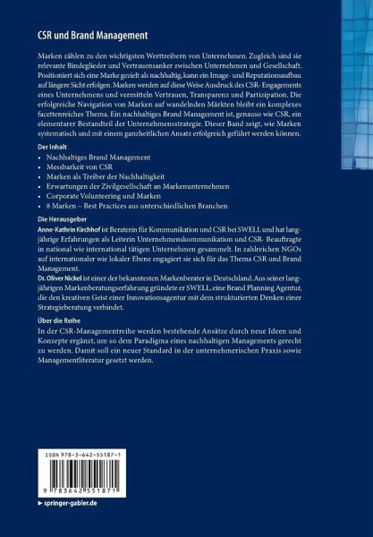 Vorwort.- Brand Management: Wie führe ich Marken erfolgreich nachhaltig?.- Zur Messbarkeit von CSR: Markenstudie "CSR auf dem Prüfstand".- Überblick: Marken als Treiber der Nachhaltigkeit in der deutschen Markenartikelindustrie.- Die Sicht der NGOs: Was erwartet die Zivilgesellschaft von Markenunternehmen und einer fairen wie zukunftsfähigen Wirtschaft?.- Der Markt: Von den Anfängen bis zur Weltleitmesse Biofach.- Fokus: Wie zahlt Corporate Volunteering auf Marken ein?.- Einblick in die Praxis: 8 Markencases - 8 Branchen, 8 individuelle Strategien, 8 Best Practices, 8 mal Transparenz.- Autorenverzeichnis.