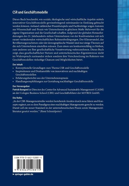 Dieses Buch beschreibt, wie soziale, ökologische und wirtschaftliche Aspekte mittels innovativer Geschäftsmodelle gewinnbringend miteinander in Einklang gebracht werden können. Anhand zahlreicher Praxisbeispiele und Fachbeiträge zeigen Autoren aus Wissenschaft und Praxis wie Unternehmen in gleichem Maße Mehrwert für die eigene Organisation und die Gesellschaft schaffen. Aufgrund der globalen Herausforderungen des 21. Jahrhunderts stehen Unternehmen vor der Konfrontation mit sich rasant verändernden wirtschaftlichen Rahmenbedingungen. Der Klimawandel, das Bevölkerungswachstum oder der demographische Wandel sind nur einige Themen auf die sich Unternehmen einstellen müssen. Zum einen um konkurrenzfähig zu bleiben, zum anderen um Ihre gesellschaftliche Verantwortung wahrzunehmen. Dieses Buch zeigt, dass gesellschaftlicher Nutzen und unternehmerisches Eigeninteresse nicht im Widerspruch zueinander stehen sondern ihre Verschmelzung im Rahmen von Geschäftsmodellen vielseitige Chancen undMöglichkeiten bietet.