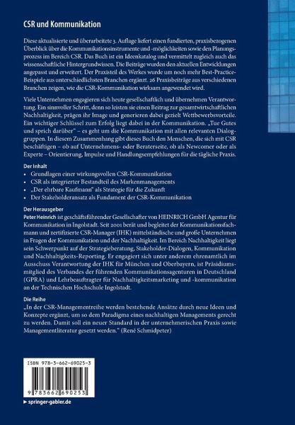 Diese aktualisierte und überarbeitete 3. Auflage liefert einen fundierten, praxisbezogenen Überblick über die Kommunikationsinstrumente und -möglichkeiten sowie den Planungsprozess im Bereich CSR. Das Buch ist ein Ideenkatalog und vermittelt zugleich auch das wissenschaftliche Hintergrundwissen. Die Beiträge wurden den aktuellen Entwicklungen angepasst und erweitert. Der Praxisteil des Werkes wurde um noch mehr Best-Practice-Beispiele aus unterschiedlichsten Branchen ergänzt. 26 Praxisbeiträge aus verschiedenen Branchen zeigen, wie die CSR-Kommunikation wirksam angewendet wird.