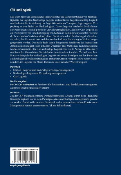 Das Buch bietet ein umfassendes Framework für die Berücksichtigung von Nachhaltigkeit in der Logistik. Nachhaltige Logistik umfasst Green Logistics und City-Logistik und bedeutet die Ausrichtung der Logistikfunktionen Transport, Lagerung und Verpackung an den Zielen der Nachhaltigkeit. Green Logistics beinhaltet Maßnahmen zur Ressourcenschonung und zur Umweltverträglichkeit. Ziel der City-Logistik ist eine verbesserte Ver- und Entsorgung von Gütern in Ballungsräumen unter Nutzung der bestehenden Verkehrsinfrastruktur. Dabei sollen der Überlastung des Straßenverkehrs, der Lärmemission und der lokalen Luftverschmutzung in Städten entgegengewirkt werden. Das Buch deckt damit die gesamte Bandbreite der logistischen Aktivitäten ab und gibt einen aktuellen Überblick über Methoden, Technologien und Maßnahmenbeispiele für eine nachhaltige Logistik. Die zweite Auflage ist aktualisiert und komplett überarbeitet. Sie beinhaltet den aktuellen Stand der Technik und Best Practice-Beispieleder nachhaltigen Logistik mit neuen Beiträgen aus den Bereichen Nachhaltigkeitsberichterstattung und Transport Carbon Footprint sowie neuen Ansätzen der City-Logistik wie Mikro-Hubs und unterirdischer Warentransport.
