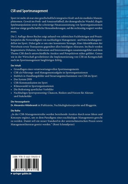 Sport nimmt heutzutage einen hohen Stellenwert im Leben der Menschen ein. Neben der Gemeinschaftsaktivität für die ganze Familie hat sich der Sport auch zu einem starken Wirtschaftszweig entwickelt. Die Verantwortung wächst und um ihr gerecht zu werden, legt Alexandra Hildebrandt in diesem Buch verschiedene CSR- und Sportmanagement-Modellen vor. Folgende Faktoren stehen dabei im Fokus: