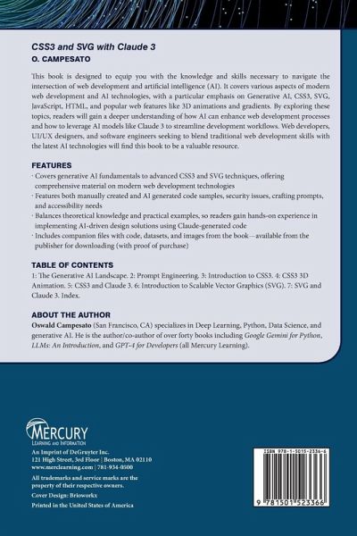 Covers generative AI fundamentals to advanced CSS3 and SVG techniques, offering comprehensive material on modern web development technologies Features both manually created and AI generated code samples, security issues, craftingprompts, and accessibility needs Balances theoretical knowledge and practical examples, so readers gain hands-on experience in implementing AI-driven design solutions using Claude-generated code Includes companion files with code, datasets, and images from the book -- available from the publisher for downloading (with proof of purchase)