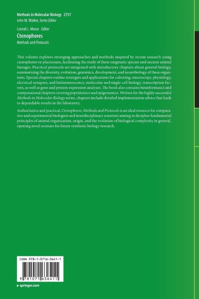 Authoritative and practical, Ctenophores: Methods and Protocols is anideal resource for comparativeand experimental biologists and interdisciplinary scientists aiming to decipher fundamental principles of animal organization, origin, and the evolution of biological complexity in general, opening novel avenues for future synthetic biology research.