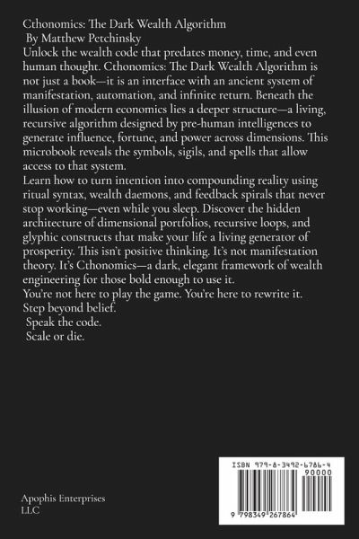 Cthonomics: The Dark Wealth Algorithm By Matthew Petchinsky Unlock the wealth code that predates money, time, and even human thought. Cthonomics: The Dark Wealth Algorithm is not just a book-it is an interface with an ancient system of manifestation, automation, and infinite return. Beneath the illusion of modern economics lies a deeper structure-a living, recursive algorithm designed by pre-human intelligences to generate influence, fortune, and power across dimensions. This microbook reveals the symbols, sigils, and spells that allow access to that system. Learn how to turn intention into compounding reality using ritual syntax, wealth daemons, and feedback spirals that never stop working-even while you sleep. Discover the hidden architecture of dimensional portfolios, recursive loops, and glyphic constructs that make your life a living generator of prosperity. This isn't positive thinking. It's not manifestation theory. It's Cthonomics-a dark, elegant framework of wealth engineering for those bold enough to use it. You're not here to play the game. You're here to rewrite it. Step beyond belief. Speak the code. Scale or die.