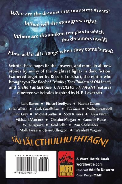 In his house at R'lyeh, Cthulhu waits dreaming... What are the dreams that monsters dream? When will the stars grow right? Where are the sunken temples in which the dreamers dwell? How will it all change when they come home? Within these pages lie the answers, and more, in all-new stories by many of the brightest lights in dark fiction. Gathered together by Ross E. Lockhart, the editor who brought you The Book of Cthulhu, The Children of Old Leech, and Giallo Fantastique, Cthulhu Fhtagn! features nineteen weird tales inspired by H. P. Lovecraft.