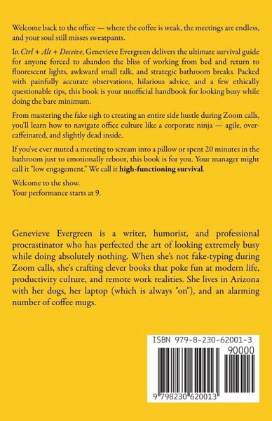 Welcome back to the office - where the coffee is weak, the meetings are endless, and your soul still misses sweatpants. In Ctrl + Alt + Deceive, Genevieve Evergreen delivers the ultimate survival guide for anyone forced to abandon the bliss of working from bed and return to fluorescent lights, awkward small talk, and strategic bathroom breaks. Packed with painfully accurate observations, hilarious advice, and a few ethically questionable tips, this book is your unofficial handbook for looking busy while doing the bare minimum. From mastering the fake sigh to creating an entire side hustle during Zoom calls, you'll learn how to navigate office culture like a corporate ninja - agile, over-caffeinated, and slightly dead inside. If you've ever muted a meeting to scream into a pillow or spent 20 minutes in the bathroom just to emotionally reboot, this book is for you. Your manager might call it "low engagement." We call it high-functioning survival. Welcome to the show. Your performance starts at 9.