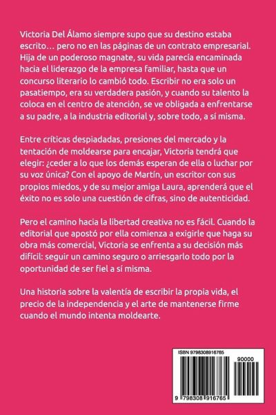 Victoria Del Álamo siempre supo que su destino estaba escrito... pero no en las páginas de un contrato empresarial. Hija de un poderoso magnate, su vida parecía encaminada hacia el liderazgo de la empresa familiar, hasta que un concurso literario lo cambió todo. Escribir no era solo un pasatiempo, era su verdadera pasión, y cuando su talento la coloca en el centro de atención, se ve obligada a enfrentarse a su padre, a la industria editorial y, sobre todo, a sí misma. Entre críticas despiadadas, presiones del mercado y la tentación de moldearse para encajar, Victoria tendrá que elegir: ¿ceder a lo que los demás esperan de ella o luchar por su voz única? Con el apoyo de Martín, un escritor con sus propios miedos, y de su mejor amiga Laura, aprenderá que el éxito no es solo una cuestión de cifras, sino de autenticidad. Pero el camino hacia la libertad creativa no es fácil. Cuando la editorial que apostó por ella comienza a exigirle que haga su obra más comercial, Victoria se enfrenta a su decisión más difícil: seguir un camino seguro o arriesgarlo todo por la oportunidad de ser fiel a sí misma. Una historia sobre la valentía de escribir la propia vida, el precio de la independencia y el arte de mantenerse firme cuando el mundo intenta moldearte.