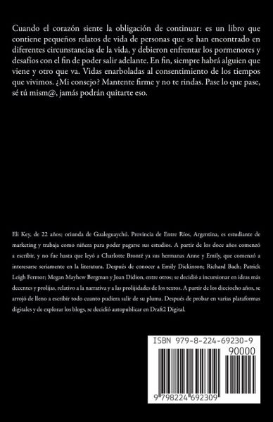 Cuando el corazón siente la obligación de continuar: es un libro que contiene pequeños relatos de vida de personas que se han encontrado en diferentes circunstancias de la vida, y debieron enfrentar los pormenores y desafíos con el fin de poder salir adelante. En realidad, estos relatos en un principio, fueron redactados para concursar en uno que otro certamen literario. Y como las reglas para participar incluían que fueran relativamente cortos; debía acortar su historia, resumir el argumento de toda la narrativa. Hasta el día de hoy me arrepiento de haber cortado y/o suprimido gran parte de los textos, con el único fin de concursar. Obvio que no gané. Y por eso mi frustración. A partir de entonces, no participo más en ningún certamen que indique: no más de diez carillas. Sin embargo, fue mi culpa, por no guardar los borradores originales. En fin, siempre habrá alguien que viene y otro que va. Vidas enarboladas al consentimiento de los tiempos que vivimos. ¿Mi consejo? Mantente firme y no te rindas. Pase lo que pase, sé tú mism@, jamás podrán quitarte eso.