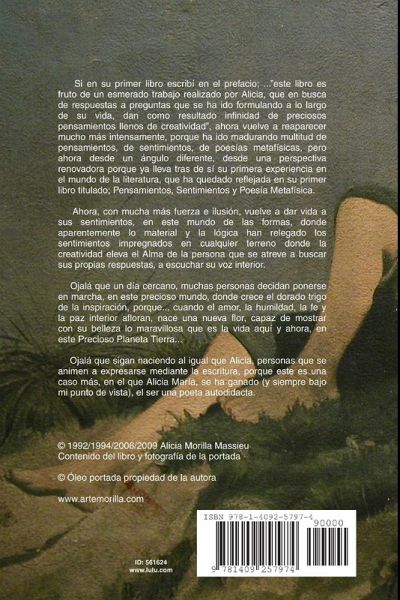 Si en su primer libro escribí en el prefacio; ..."este libro es fruto de un esmerado trabajo realizado por Alicia, que en busca de respuestas a preguntas que se ha ido formulando a lo largo de su vida, dan como resultado infinidad de preciosos pensamientos llenos de creatividad", ahora vuelve a reaparecer mucho más intensamente, porque ha ido madurando multitud de pensamientos, de sentimientos, de poesías metafísicas, pero ahora desde un ángulo diferente, desde una perspectiva renovadora porque ya lleva tras de sí su primera experiencia en el mundo de la literatura, que ha quedado reflejada en su primer libro titulado; Pensamientos, Sentimientos y Poesía Metafísica. Página Web de la autora www.artemorilla.com