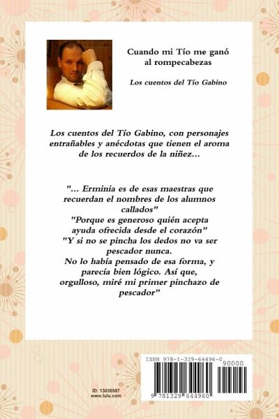 Los cuentos del Tío Gabino, con personajes entrañables y anécdotas que tienen el aroma de los recuerdos de la niñez "... Erminia es de esas maestras que recuerdan el nombres de los alumnos callados" "Porque es generoso quién acepta ayuda ofrecida desde el corazón" "Y si no se pincha los dedos no va ser pescador nunca. No lo había pensado de esa forma, y parecía bien lógico. Así que, orgulloso, miré mi primer pinchazo de pescador "