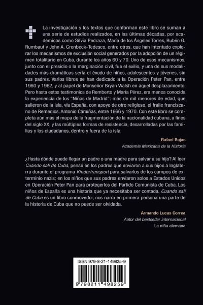 ¿Hasta dónde puede llegar un padre o una madre para salvar a su hijo? Al leer Cuando salí de Cuba, pensé en los padres que enviaron a sus hijos a Inglaterra durante el programa Kindertransport para salvarlos de los campos de exterminio nazis; en los niños que sus padres enviaron solos a Estados Unidos en Operación Pedro Pan para protegerlos del Partido Comunista de Cuba. Los niños de España es una historia que ya necesitaba ser contada. Cuando salí de Cuba es un libro conmovedor, nos narra en primera persona una parte de la historia de Cuba que no puede ser olvidada. [Armando Lucas Correa]