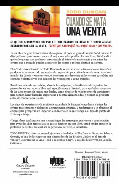 Hay aproximadamente 12.2 millones de vendedores en los EE.UU. ¿¿Eso significa una de cada veintitr¿¿s personas! Los vendedores est¿¿n en todos lados, vendiendo cualquier cosa imaginable. Algunos son excelentes, pero un gran porcentaje de ellos acaban siendo v¿¿ctimas de la industria de las ventas y de sus propios errores. Algunos de estos errores s¿¿lo son obst¿¿culos en el camino hacia el ¿¿xito. Otros, sin embargo, son m¿¿s dä¿inos. Y desgraciadamente muchos errores acaban con la carrera de las ventas. Duncan se refiere a estos errores catastr¿¿ficos con claridad y al punto. Sin importar si eres un vendedor profesional veterano, o alguien que est¿¿ considerando la carrera de las ventas, la sabidur¿¿a de Duncan te ayudar¿¿ a evitar los errores en la percepci¿¿n, la pr¿¿ctica y el desempe¿¿o que no s¿¿lo podr¿¿an acabar con una venta sino tambi¿¿n con tu carrera.
