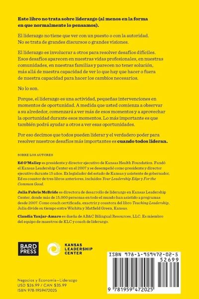 Este libro no trata sobre liderazgo (al menos en la forma en que normalmente lo pensamos). El liderazgo no tiene que ver con un puesto o con la autoridad. No se trata de grandes discursos o grandes visiones. El liderazgo es involucrar a otros para resolver desafíos difíciles. Esos desafíos aparecen en nuestras vidas profesionales, en nuestras comunidades, en nuestras familias y parecen no tener solución, más allá de nuestra capacidad de ver lo que hay que hacer o fuera de nuestra capacidad para hacer los cambios necesarios. No lo son. Porque, el liderazgo es una actividad, pequeñas intervenciones en momentos de oportunidad. A medida que usted comienza a observar a su alrededor, comenzará a ver más de esos momentos y a aprovechar la oportunidad durante esos momentos. Lo más importante es que también podrá ayudar a otros a ver esas oportunidades. Por eso decimos que todos pueden liderar y el verdadero poder para resolver nuestros desafíos más importantes es cuando todos lideran.