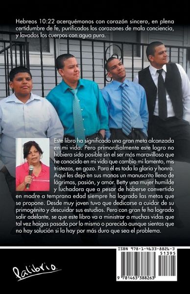 Hebreos 10:22 acerquémonos con corazón sincero, en plena certidumbre de fe, purificados los corazones de mala conciencia, y lavados los cuerpos con agua pura. Este libro ha significado una gran meta alcanzada en mi vida. Pero primordialmente este logro no hubiera sido posible sin el ser más maravilloso que he conocido en mi vida que cambio mi lamento, mis tristezas, en gozo. Para él es toda la gloria y honra. Aquí les dejo en sus manos un manuscrito lleno de lágrimas, pasión, y amor. Betty una mujer humilde y luchadora que a pesar de haberse convertido en madre a temprana edad siempre ha logrado las metas que se propone. Desde muy joven tuvo que dedicarse a cuidar de su primogénito y descuidar sus estudios. Pero con gran fe ha logrado salir adelante, se que este libro va a ministrar a muchas vidas que tal vez haigas pasado por lo mismo o parecido aunque sientas que no hay solución si la hay por más duro que sea el problema.