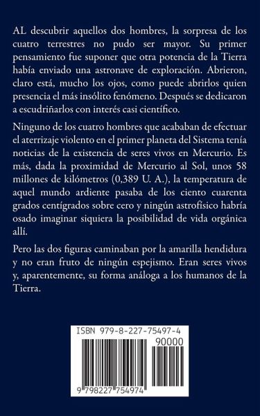 AL descubrir aquellos dos hombres, la sorpresa de los cuatro terrestres no pudo ser mayor. Su primer pensamiento fue suponer que otra potencia de la Tierra había enviado una astronave de exploración. Abrieron, claro está, mucho los ojos, como puede abrirlos quien presencia el más insólito fenómeno. Después se dedicaron a escudriñarlos con interés casi científico. Ninguno de los cuatro hombres que acababan de efectuar el aterrizaje violento en el primer planeta del Sistema tenía noticias de la existencia de seres vivos en Mercurio. Es más, dada la proximidad de Mercurio al Sol, unos 58 millones de kilómetros (0,389 U. A.), la temperatura de aquel mundo ardiente pasaba de los ciento cuarenta grados centígrados sobre cero y ningún astrofísico habría osado imaginar siquiera la posibilidad de vida orgánica allí. Pero las dos figuras caminaban por la amarilla hendidura y no eran fruto de ningún espejismo. Eran seres vivos y, aparentemente, su forma análoga a los humanos de la Tierra.