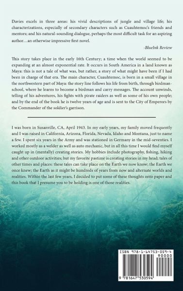 Davies excels in three areas: his vivid descriptions of jungle and village life; his characterizations, especially of secondary characters such as Cuauhtemoc’s friends and mentors; and his natural-sounding dialogue, perhaps the most difficult task for an aspiring author…an otherwise impressive first novel. -BlueInk Review This story takes place in the early 16th Century; a time when the world seemed to be expanding at an almost exponential rate. It occurs in South America in a land known as Maya: this is not a tale of what was, but rather, a story of what might have been if I had been in charge of that era. The main character, Cuauhtemoc, is born in a small village in the northwestern part of Maya: the story line follows his life from birth, through birdmanschool, where he learns to become a birdman and carry messages. The account unwinds, telling of his adventures, his fights with pirate raiders as well as some of his own people; and by the end of the book he is twelve years of age and is sent to the City of Emperors by the Commander of the soldier’s garrison.