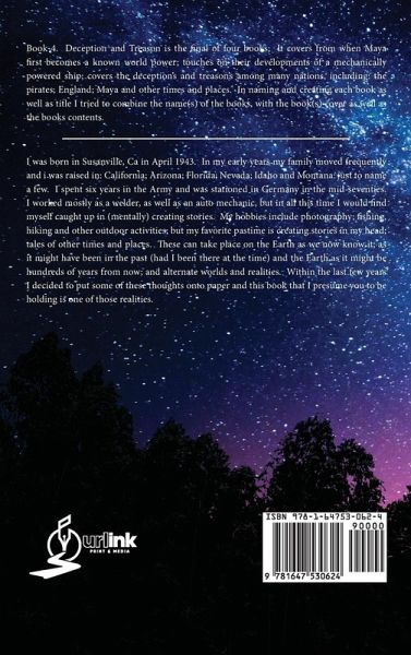 Book 4. Deception and Treason is the final of four books; It covers from when Maya first becomes a known world power; touches on their developments of a mechanically powered ship; covers the deception’s and treason’s among many nations, including: the pirates; England; Maya and other times and places. In naming and creating each book as well as title I tried to combine the name(s) of the books, with the book(s) cover as well as the books contents.