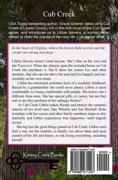 In the heart of Virginia, where the forests shelter secrets and the creeks run strong and deep ~ Libbie Havens doesn't need anyone. She's fine on her own. When she chances upon the secluded house on Cub Creek she purchases it. She'll show her cousin Liz, and other doubters, that she can rise above her past and live happily and successfully on her own terms. Libbie has emotional problems born of a troubled childhood. Raised by a grandmother she could never please, Libbie is more comfortable not being comfortable with people. She knows she's different from most. She has special gifts, or curses,…mehr