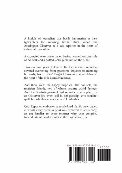 A huddle of journalists was busily hammering at their typewriters the morning Irvine Hunt joined the Accrington Observer as a cub reporter in the heart of industrial Lancashire. A crumpled wire waste paper basket awaited on one side of his desk and a potted lanky geranium on the other. Two exciting years followed. Its half-a-dozen reporters covered everything from gruesome inquests to numbing blizzards, from Ladies' Bright Hours to a store ablaze in the heart of the little Lancashire town. And there were the happy surprises. The contacts, the musician friends, two of whom became world famous. And the 30-shilling-a-week girl reporter who applied for an Observer job when still in her gymslip, who couldn't spell, but who went on to become a successful publisher. Cub Reporter embraces a much-liked family newspaper, in which every name in print was expected to sell a copy, an era familiar to every reporter who ever compiled funeral lists of floral tributes in the days of hot type.