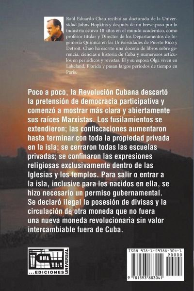 Raúl Eduardo Chao received his doctorate from Johns Hopkins University and, after a brief stint in the industry, he spent 18 years in the academic world as a tenured professor and Director of the Departments of Chemical Engineering at the Universities of Puerto Rico and Detroit. In 1986, he founded a consulting company focused on helping companies and government agencies simultaneously improve the productivity as well as quality of their services. As President of Systema, Chao has written a dozen books on management, science and history of Cuba along with publishing numerous articles in newspapers and magazines. He and his wife Olga live in Lakeland, Florida and spend long periods of time in Paris. CUBA IN 1959: Little by little, the Cuban Revolution discarded the pretense of participatory democracy and began to show its Marxist roots more clearly and openly. The executions were extended; the confiscations increased until all the private property on the island was finished; all private schools closed; Religious expressions were confined exclusively within the churches and temples. To leave or enter the island, including those born in it, a government permit was necessary. The possession of foreign currency and the circulation of another currency that was not a new revolutionary currency without exchangeable value outside of Cuba was declared illegal.