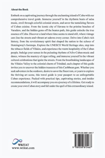 Embark on a captivating journey through the enchanting island of Cuba with our comprehensive travel guide. Immerse yourself in the rhythmic beats of salsa music, stroll through colorful colonial streets, and savor the tantalizing flavors of Cuban cuisine. From the iconic city of Havana to the pristine beaches of Varadero, and the hidden gems off the beaten path, this guide unlocks the true essence of Cuba. Discover a land where time seems to stand still, where vintage cars line the streets and vibrant art adorns every corner. Delve into Cuba's rich history, from the revolutionary spirit that shaped the nation to the echoes of Hemingway's footsteps. Explore the UNESCO World Heritage sites, step into the tobacco fields of Viñales, and experience the warm hospitality of the Cuban people. Indulge your senses in the pulsating rhythms of Afro-Cuban music and dance, witness the mastery of cigar rolling, and immerse yourself in the vibrant cultural celebrations that ignite the streets. From the breathtaking landscapes of the Viñales Valley to the colonial charm of Trinidad, each chapter of this guide invites you to uncover the hidden treasures of this Caribbean gem. Whether you seek adventure in the outdoors, desire to savor the finest rum, or yearn to explore the thriving art scene, this travel guide is your passport to an unforgettable Cuban experience. Packed with practical tips, captivating stories, and insider recommendations, it will accompany you on a journey of a lifetime. Get ready to create your own Cuban story and fall under the spell of this extraordinary island.