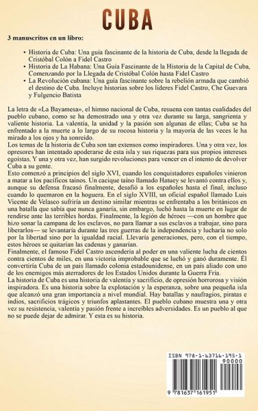 4 manuscritos completos en 1 libroHistoria de Cuba: Una guía fascinante de la historia de Cuba, desde la llegada de Cristóbal Colón a Fidel Castro Historia de La Habana: Una Guía Fascinante de la Historia de la Capital de Cuba, Comenzando por la Llegada de Cristóbal Colón hasta Fidel Castro La Revolución cubana: Una guía fascinante sobre la rebelión armada que cambió el destino de Cuba. Incluye historias sobre los líderes Fidel Castro, Che Guevara y Fulgencio Batista Fidel Castro: Una guía fascinante de un revolucionario comunista cubano que sirvió como presidente de Cuba durante más de 30 años Los temas de la historia de Cuba son tan extensos como inspiradores. Cuba se ha enfrentado a la muerte a lo largo de su rocosa historia y la mayoría de las veces le ha mirado a los ojos y ha sonreído. Una y otra vez, los opresores han intentado apoderarse de esta isla y sus riquezas para sus propios intereses egoístas. Y una y otra vez, han surgido revoluciones para vencer en el intento de devolver Cuba a su gente. La historia de Cuba es una historia de valentía y sacrificio, de opresión horrorosa y visión inspiradora. Es una historia sobre la explotación y la esperanza, sobre una pequeña isla que alcanzó una gran importancia a nivel mundial. Hay batallas y naufragios, piratas e indios, sacrificios trágicos y triunfos aplastantes. El pueblo cubano muestra una y otra vez su resistencia, valentía y pasión frente a increíbles adversidades. Es un pueblo al que no se puede dejar de admirar. Y en este fascinante libro, descubrirá su historia. La primera parte de este libro incluye:Cuba antes de Colón La llegada de los españoles Esclavitud y caña de azúcar La Guerra El Grito de Yara Libertad Por fin independientes Un nuevo líder La Cuba de Castro Tiempos desesperados Un nuevo horizonte ¡Y mucho, mucho más! Segunda parte de este libro, usted:La Fundación de La Habana Yuca, Canales y los Corsarios Franceses El Asedio de La Habana Los Esclavos de La Habana Huracanes Comienza La Lucha por la Independencia "Recuerden el Maine" La Gran Vida de La Habana Otra Revolución La Victoria de Castro La Habana de Castro ¡Y mucho, mucho más! Tercera parte de este libro, usted:Un repaso sobre la historia de Cuba La historia de Sargento Batista La rebelión de los sargentos Comienzo de la revolución El MR-26-7 Una reunión fatídica El viaje del Granma Operación Verano y victoria Y mucho, mucho más... Cuarta parte de este libro, usted:Un líder improbable Convirtiéndose en El Comandante El primer contacto con la revolución Una luna de miel en Nueva York Encendiendo la Revolución La historia me absolverá La Revolución Cubana Chocando con el Tío Sam Fracaso Una Cuba sin Castro ¡Y mucho, mucho más! ¡Obtenga este libro ahora para aprender más sobre Cuba!