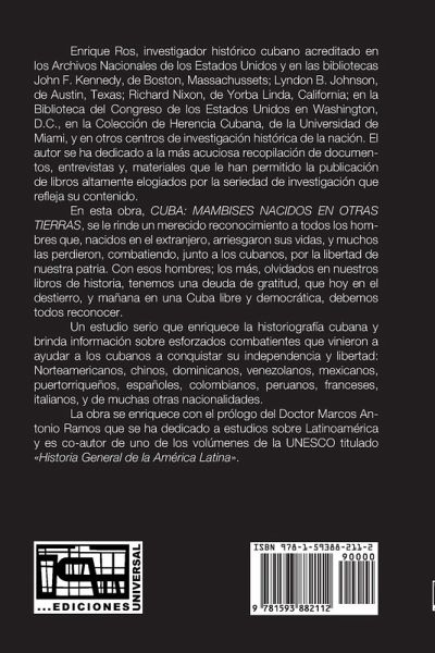 Enrique Ros (Enrique Emilio Ros y Pérez) nació en Cuba en 1924 y falleció en Miami el 10 de abril de 2013. Empresario exitoso y figura prominente de la lucha por la libertad y en contra del castrismo, dedicó los últimos años de su vida a escribir sobre Cuba. Investigador histórico acreditado en los Archivos Nacionales de los Estados Unidos y en las bibliotecas de importantes universidades, se ha dedicó a la más acuciosa recopilación de documentos, entrevistas y materiales que le permitieron la publicación de libros altamente elogiados por la seriedad de investigación que refleja su contenido. Ros ha publicado 18 valiosos libros sobre el proceso revolucionario cubano, biografías de forjadores de la independencia de Cuba y otros temas históricos cubanos, que se han convertido en obligatorias obras de referencia en el presente y futuro. En esta obra, CUBA: MAMBISES NACIDOS EN OTRAS TIERRAS, se le rinde un merecido reconocimiento a todos los hombres que, nacidos en otras tierras, arriesgaron sus vidas, y muchos las perdieron, combatiendo, junto a los cubanos, por la libertad de Cuba durante las guerras de independencia del Siglo XIX. Un estudio serio que enriquece la historiografía cubana y brinda información sobre esforzados combatientes que vinieron a ayudar a los cubanos a conquistar su independencia y libertad: Norteamericanos, chinos, dominicanos, venezolanos, mexicanos, puertorriqueños, españoles, colombianos, peruanos, franceses, italianos, y de muchas otras nacionalidades. ***** Enrique Ros (Enrique Emilio Ros y Pérez) was born in Cuba in 1924 and died in Miami on April 10, 2013. A successful businessman and prominent figure in the fight for freedom and against Castroism, he dedicated the last years of his life to write about Cuba. An accredited historical researcher in the National Archives of the United States and in the libraries of important universities, he has dedicated himself to the most meticulous compilation of documents, interviews and materials that allowed him to publish books highly praised for the seriousness of research that reflects his content. Ros has published 18 valuable books on the Cuban revolutionary process, biographies of those who forged Cuban independence and other Cuban historical topics, which have become obligatory reference works in the present and future. This book pays due homage and recognition to all those men of other countries (American, Chinese, Dominicans, Venezuelans, Mexicans, Puerto Ricans, Spanish, Colombian, Peruvian, French, Italian and many other nationalities) who risked their lives fighting alongside Cubans during the independence wars of the 19th century. It is a serious study that enriches Cuban historiography and provides information about brave fighters who came to