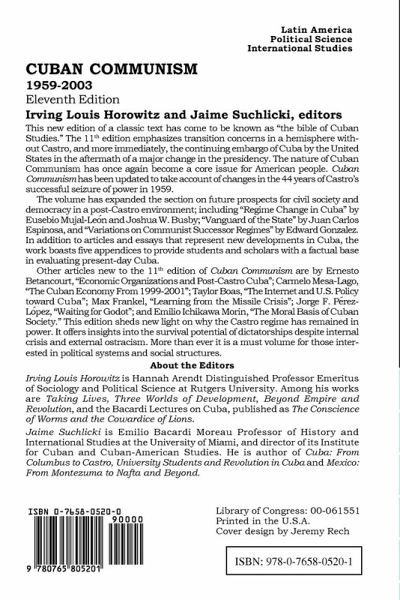 "Cuban Communism remains, like its previous ten editions, an important contribution to the field of Cuban Studies. It includes many useful chronological facts, as well as a selection of Fidel Castro's speeches which are interesting and informative for any reader interested in the island." -- Maria Gropas, Department of Social Anthropology, University of Cambridge This new 11th edition of a classic text, come to be known as "the bible of Cuban Studies," emphasizes two key issues of the twenty-first century. First, transition concerns in a world without Castro, and second, the continuing embargo of Cuba by the United States in the aftermath of a major change in the presidency. Cuban Communism has been updated to take account of changes in the 44 years of Castro's rule since seizing power in 1959. In addition to articles and essays that represent new developments in Cuba, the work boasts a database upgrade that makes it more important to students, scholars, and researchers. The volume has expanded the section on future prospects for civil society and democracy in a post-Castro environment; including "Regime Change in Cuba" by Eusebio Mujal-Leon and Joshua W. Busby; "Transition Scenarios" by Randolph H. Pherson, and "A Policy Conundrum over Cuba" by Edward Gonzalez. It also contains a chronology of events from 1959 through 2002. Finally, the new work contains a carefully constructed Who's Who of important players in Cuba and the regime during the Castro period up to the present. Other articles new to the 11th edition of Cuban Communism are by Ernesto Betancourt, "Cuba's Balance of Payment Gap"; Carmelo Mesa-Lago, "The Cuban Economy From 1999-2001"; Taylor Boas, "The Internet and U.S. Policy toward Cuba"; Aldo M. Leiva, "Environmental Technology Transfer and Foreign Investment"; Moises Asis, "Judaism in Cuba"; Wolf Grabendorff, "A View from the European Union." More than ever, it is a must volume for those interested in political systems and social structures. Irving Louis Horowitz is Hannah Arendt Distinguished Professor Emeritus of Sociology and Political Science at Rutgers University. Among his works are Three Worlds of Development, Beyond Empire and Revolution, and his Bacardi Lectures on Cuba that was published as The Conscience of Worms and the Cowardice of Lions. Jaime Suchlicki is Bacardi Professor of History at the Graduate School of International Studies at the University of Miami, and executive director of its Cuban-American and Cuban Center. He is author of From Columbus to Castro, University Students and Revolution in Cuba, and Mexico: From Montezuma to Nafta and Beyond.