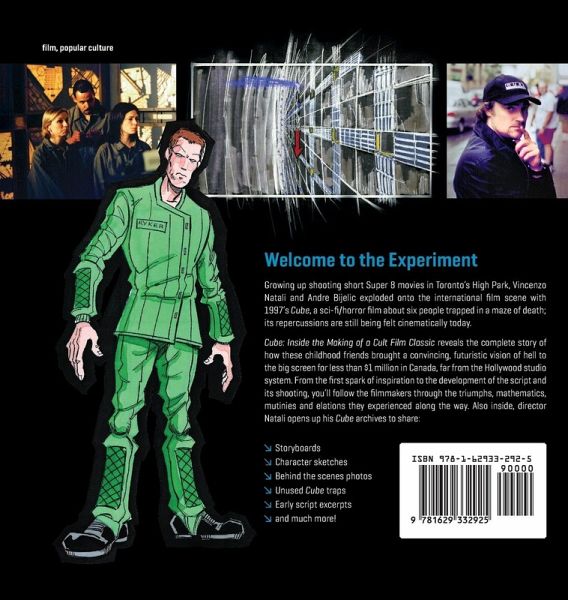 Welcome to the Experiment. Growing up shooting short Super 8 movies in Toronto’s High Park, Vincenzo Natali and Andre Bijelic exploded onto the international ¿lm scene with 1997’s Cube, a sci-¿ /horror ¿lm about six people trapped in a maze of death; its repercussions are still being felt cinematically today. Cube: Inside the Making of a Cult Film Classic reveals the complete story of how these childhood friends brought a convincing, futuristic vision of hell to the big screen for less than $1 million in Canada, far from the Hollywood studio system. From the ¿rst spark of inspiration to the development of the script and its shooting, you’ll follow the ¿lmmakers through the triumphs, mathematics, mutinies and elations they experienced along the way. Also inside, director Natali opens up his Cube archives to share: Storyboards Character sketches Behind the scenes photos Unused Cube traps Early script excerpts and much more!