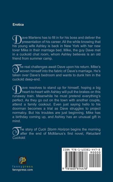Dave Martens has to fill in for his boss and deliver the presentation of his career. All the while knowing that his young wife Ashley is back in New York with her new lover Mike in their marriage bed. Mike, the guy Dave met in a cuckold chat room, whom Ashley believes is an old friend from summer camp. The real challenges await Dave upon his return. Mike's woven himself into the fabric of Dave's marriage. He's taken over Dave's bedroom and wants to dunk him in the cuckold deep-end. Dave resolves to stand up for himself, hoping a big heart-to-heart with Ashley will pull the brakes on this runaway train. Meanwhile he must pretend everything's perfect. As they go out on the town with another couple, attend a family cookout. Even just saying hello to his doorman becomes a trial as Dave struggles to project normalcy. But his troubles are just beginning. Mike has a birthday coming up, and Ashley has an unusual gift in mind. The story of Cuck Storm Horizon begins the morning after the end of McManus's first novel, Reluctant Cuckold.