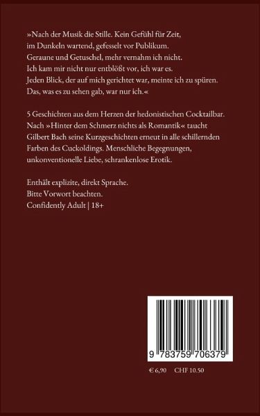 »Nach der Musik die Stille. Kein Gefühl für Zeit, im Dunkeln wartend, gefesselt vor Publikum. Geraune und Getuschel, mehr vernahm ich nicht. Ich kam mir nicht nur entblößt vor, ich war es. Jeden Blick, der auf mich gerichtet war, meinte ich zu spüren. Das, was es zu sehen gab, war nur ich.« 5 Geschichten aus dem Herzen der hedonistischen Cocktailbar. Nach »Hinter dem Schmerz nichts als Romantik« taucht Gilbert Bach seine Kurzgeschichten erneut in alle schillernden Farben des Cuckoldings. Menschliche Begegnungen, unkonventionelle Liebe, schrankenlose Erotik. Eine candaulistische Feier des Lebens.Enthält explizite, direkt Sprache. Bitte Vorwort beachten.