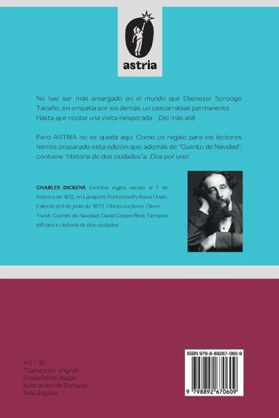 No hay ser más amargado en el mundo que Ebenezer Scrooge. Tacaño, sin empatía por los demás, un cascarrabias permanente. Hasta que recibe una visita inesperada... ¡Del más allá! Pero ASTRIA no se queda aquí. Como un regalo para los lectores, hemos preparado esta edición que, además de Un cuento de Navidad, contiene Historia de dos ciudades. ¡Dos por uno!