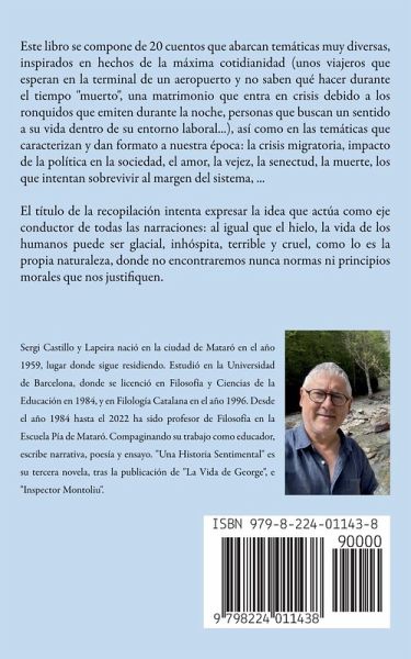 Este libro se compone de 20 cuentos que abarcan temáticas muy diversas, inspirados en hechos de la máxima cotidianidad (unos viajeros que esperan en la terminal de un aeropuerto y no saben qué hacer durante el tiempo "muerto", una matrimonio que entra en crisis debido a los ronquidos que emiten durante la noche, personas que buscan un sentido a su vida dentro de su entorno laboral...), así como en las temáticas que caracterizan y dan formato a nuestra época: la crisis migratoria, impacto de la política en la sociedad, el amor, la vejez, la senectud, la muerte, los que intentan sobrevivir al margen del sistema, ... El título de la recopilación intenta expresar la idea que actúa como eje conductor de todas las narraciones: al igual que el hielo, la vida de los humanos puede ser glacial, inhóspita, terrible y cruel, como lo es la propia naturaleza, donde no encontraremos nunca normas ni principios morales que nos justifiquen.