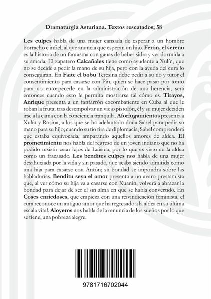 Dramaturgia Asturiana. Textos rescatados; 58 "Les culpes" habla de una mujer cansada de esperar a un hombre borracho e infiel, al que anuncia que esperan un hijo. "Ferón, el serenu" es la historia de un fantasma con ganas de beber sidra y ver dormida a su amada. El zapatero "Calcañales" tiene como ayudante a Xulín, que no se decide a pedir la mano de su hija, pero con la ayuda del cura lo conseguirán. En "Faite el bobu" Teresina debe pedir a su tío y tutor el consentimiento para casarse con Pin, quien se hace pasar por tonto para no entorpecerle en la administración de una herencia; será entonces cuando esto le permita mostrarse tal cómo es. "Tírayos, Anrique" presenta a un fanfarrón excombatiente en Cuba al que le roban la fruta; tras desempolvar un viejo pistolón, él y su mujer deciden irse a la cama con la conciencia tranquila. "Aforfugamientos" presenta a Xulín y Rosina, a los que se ha adelantado doña Sabel para pedir su mano para su hijo; cuando su tío tira de diplomacia, Sabel comprenderá que estaba equivocada, amparando aquellos amores de aldea. "El prometimientu" nos habla del regreso de un joven indiano que no ha podido resistir estar lejos de Luisina, por lo que es visto en la aldea como un fracasado. "Les bendites culpes" nos habla de una mujer desahuciada por la vida y sin pasado, que acaba siendo admitida como una hija para casarse con Antón; su bondad se impondrá sobre las habladurías. "Benditu seya el amor" presenta a un avaro prestamista que, al ver cómo su hija va a casarse con Xuanín, volverá a abrazar la bondad para dejar de ser el sin alma en que se había convertido. En "Coses enriedoses", que empieza con una reivindicación feminista, el cura reconoce un antiguo amor que ha regresado a la aldea en su última escala vital. "Aloyeros" nos habla de la renuncia de los sueños por lo que se tiene, una pobreza alegre.