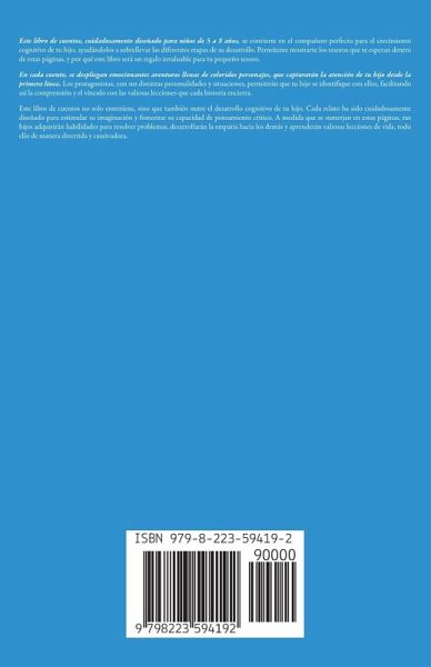 Este libro de cuentos, cuidadosamente diseñado para niños de 5 a 8 años, se convierte en el compañero perfecto para el crecimiento cognitivo de tu hijo, ayudándolos a sobrellevar las diferentes etapas de su desarrollo. Permíteme mostrarte los tesoros que te esperan dentro de estas páginas, y por qué este libro será un regalo invaluable para tu pequeño tesoro. En cada cuento, se despliegan emocionantes aventuras llenas de coloridos personajes, que capturarán la atención de tu hijo desde la primera línea. Los protagonistas, con sus distintas personalidades y situaciones, permitirán que tu hijo se identifique con ellos, facilitando así la comprensión y el vínculo con las valiosas lecciones que cada historia encierra. Este libro de cuentos no solo entretiene, sino que también nutre el desarrollo cognitivo de tu hijo. Cada relato ha sido cuidadosamente diseñado para estimular su imaginación y fomentar su capacidad de pensamiento crítico. A medida que se sumerjan en estas páginas, tus hijos adquirirán habilidades para resolver problemas, desarrollarán la empatía hacia los demás y aprenderán valiosas lecciones de vida, todo ello de manera divertida y cautivadora.