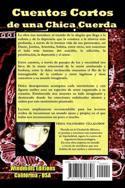 La obra nos introduce al mundo de la alegría que llega a la euforia y de la depresión que la conduce a la tristeza más profunda, a través de la intensa vida de sus personajes, así Dante, Justina, Artemisa, Sabina, entre otros, nos muestran el lado más intenso del suicidio, la adicción, la prostitución, la depresión y el amor. Estos cuentos, a través de pasajes de luz y oscuridad nos lleva de la mano emocional de la razón arrebatada y burlona, entre la dulce melancolía cruzamos el filo de lo inimaginable de la cordura y entre lágrimas y risas cruzamos a su mundo imaginario. Dulce desesperanza acompasa cada movimiento y con figuras sutiles crea un espectro de amor engarzado a su corazón. Entristecida nos muestra su lado imaginario y destrozado donde las emociones enfatizadas sienten y sufren por este sentimiento plasmado. Lectura ampliamente recomendable para los lectores ávidos de incursionar un mundo ajeno y propio; en el que todos nos reconocemos un poco o mucho.