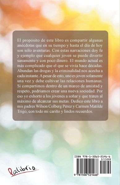 El propósito de este libro es compartir algunas anécdotas que en su tiempo y hasta el día de hoy son sólo aventuras. Con estas narraciones doy fe y ejemplo que cualquier joven se puede divertir sanamente y con poco dinero. El mundo actual es más complicado que el que se vivía hace décadas. Abundan las drogas y la criminalidad nos acecha a cada instante. A pesar de esto, uno es joven solamente una vez y debe cultivar las relaciones humanas. Si compartimos dentro de un marco de amistad y respeto, podríamos crear una nueva sociedad. Por eso yo exhorto a los jóvenes a soñar y que traten al máximo de alcanzar sus metas. Dedico este libro a mis padres Wilson Colberg Pérez y Carmen Matilde Trigo, con todo mi cariño y lindos recuerdos.