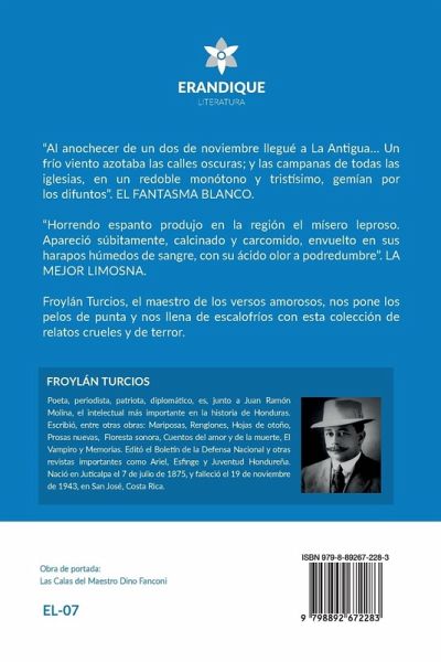 "Al anochecer de un dos de noviembre llegué a La Antigua... Un frío viento azotaba las calles oscuras; y las campanas de todas las iglesias, en un redoble monótono y tristísimo, gemían por los difuntos". EL FANTASMA BLANCO. "Horrendo espanto produjo en la región el mísero leproso. Apareció súbitamente, calcinado y carcomido, envuelto en sus harapos húmedos de sangre, con su ácido olor a podredumbre". LA MEJOR LIMOSNA. Froylán Turcios, el maestro de los versos amorosos, nos pone los pelos de punta y nos llena de escalofríos con esta colección de relatos crueles y de terror.