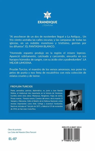 "Al anochecer de un dos de noviembre llegué a La Antigua... Un frío viento azotaba las calles oscuras; y las campanas de todas las iglesias, en un redoble monótono y tristísimo, gemían por los difuntos". EL FANTASMA BLANCO. "Horrendo espanto produjo en la región el mísero leproso. Apareció súbitamente, calcinado y carcomido, envuelto en sus harapos húmedos de sangre, con su ácido olor a podredumbre". LA MEJOR LIMOSNA. Froylán Turcios, el maestro de los versos amorosos, nos pone los pelos de punta y nos llena de escalofríos con esta colección de relatos crueles y de terror.