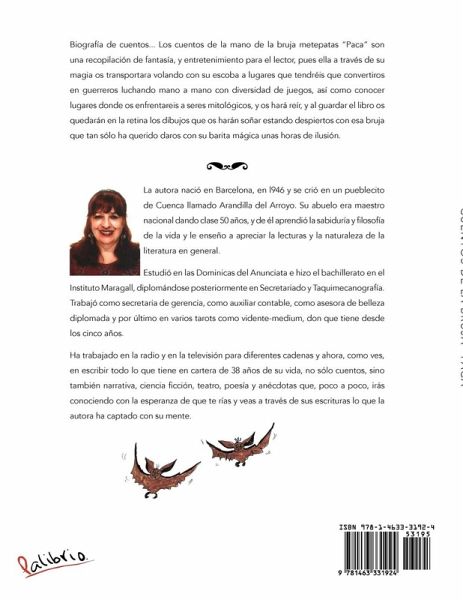 Biografía de cuentos... Los cuentos de la mano de la bruja metepatas "Paca" son una recopilación de fantasía, y entretenimiento para el lector, pues ella a través de su magia os transportara volando con su escoba a lugares que tendréis que convertiros en guerreros luchando mano a mano con diversidad de juegos, así como conocer lugares donde os enfrentareis a seres mitológicos, y os hará reír, y al guardar el libro os quedarán en la retina los dibujos que os harán soñar estando despiertos con esa bruja que tan sólo ha querido daros con su barita mágica unas horas de ilusión.