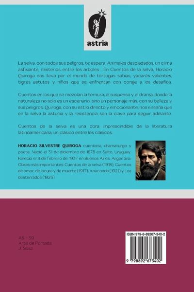 La selva, con todos sus peligros, te espera. Animales despiadados, un clima asfixiante, misterios entre los árboles... En Cuentos de la selva, Horacio Quiroga nos lleva por el mundo de tortugas sabias, yacarés valientes, tigres astutos y niños que se enfrentan con coraje a los desafíos. Cuentos en los que se mezclan la ternura, el suspenso y el drama, donde la naturaleza no solo es un escenario, sino un personaje más, con su belleza y sus peligros. Quiroga, con su estilo directo y emocionante, nos enseña que en la selva la astucia y la resistencia son la clave para seguir adelante. Cuentos de la selva es una obra imprescindible de la literatura latinoamericana, un clásico entre los clásicos. Sobre el autor: Horacio Silvestre Quiroga, cuentista, dramaturgo y poeta. Nació el 31 de diciembre de 1878 en Salto, Uruguay. Falleció el 9 de febrero de 1937 en Buenos Aires, Argentina. Obras más importantes: Cuentos de la selva (1918), Cuentos de amor, de locura y de muerte (1917), Anaconda (1921) y Los desterrados (1926).