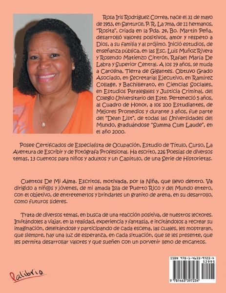 Cuentos De Mi Alma. Escritos, motivada, por la Niña, que llevo dentro. Va dirigido a niñ@s y jóvenes, de mi amada Isla de Puerto Rico y del Mundo entero, con el objetivo, de entretenerlos y brindarles un granito de arena, en su desarrollo, como futuros líderes. Trata de diversos temas, en busca de una reacción positiva, de nuestros lectores. Invitándoles a viajar, en la realidad, experiencia y fantasía, e incitándolos a recrear su imaginación, deleitándose y participando de cada escena, las cuales, les mostraran, que siempre, hay una luz de esperanza, en cada situación, que se les presente, que les permita desarrollar valores y que sueñen con un porvenir lleno de encantos.