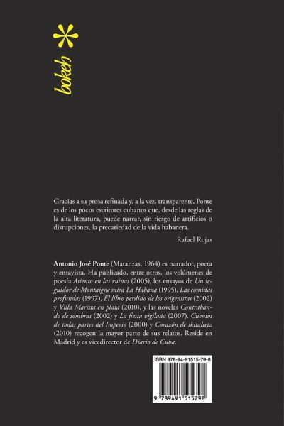 «Gracias a su prosa refinada y, a la vez, transparente, Ponte es de los pocos escritores cubanos que, desde las reglas de la alta literatura, puede narrar, sin riesgo de artificios o disrupciones, la precariedad de la vida habanera» (Rafael Rojas). Antonio José Ponte (Matanzas, 1964) es narrador, poeta y ensayista. Ha publicado, entre otros, los volúmenes de poesía Asiento en las ruinas (2005), los ensayos de Un seguidor de Montaigne mira La Habana (1995), Las comidas profundas (1997), El libro perdido de los origenistas (2002) y Villa Marista en plata (2010), y las novelas Contrabando de sombras (2002) y La fiesta vigilada (2007). Cuentos de todas partes del Imperio (2000) y Corazón de skitalietz (2010) recogen la mayor parte de sus relatos. Reside en Madrid y es vicedirector de Diario de Cuba.