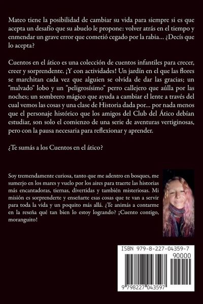 Mateo tiene la posibilidad de cambiar su vida para siempre si es que acepta un desafío que su abuelo le propone: volver atrás en el tiempo y enmendar un grave error que cometió cegado por la rabia... ¿Decís que lo acepta? Cuentos en el ático es una colección de cuentos infantiles para crecer, creer y sorprendente. ¡Y con actividades! Un jardín en el que las flores se marchitan cada vez que alguien se olvida de dar las gracias; un "malvado" lobo y un "peligrosísimo" perro callejero que aúlla por las noches; un sombrero mágico que ayuda a cambiar el lente a través del cual vemos las cosas y una clase de Historia dada por... por nada menos que el personaje histórico que los amigos del Club del Ático debían estudiar, son solo el comienzo de una serie de aventuras vertiginosas, pero con la pausa necesaria para reflexionar y aprender. ¿Te sumás a los Cuentos en el ático?