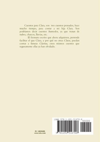 Cuentos para Clara, Son tres cuentos, pensados para contar a mi hija Clara, hace ya bastantes años. Podría llamarles "cuentos humedosª, no tanto por la edad de los niños a los que van dirigídos, sino porque tratan de charcos, nubes, lluvias y nieblas. El primero de los tres cuentos, el más largo, tiene como protagonista a una familia de magos, que intentaran mantener la sorpresa y curiosidad en los niños. El segundo y el tercero, tratan de las relaciones de Clara con las nubes en distintas oportunidades.