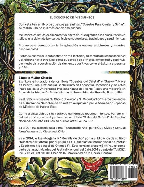 EL CONCEPTO DE MIS CUENTOS Con este tercer libro de cuentos para niños, "Cuentos Para Contar y Soñar", se realiza uno de mis más anhelados sueños. Me inspiré en situaciones reales y de fantasía, que agradan a los niños. Ponen en relieve una visión de la vida que incluye costumbres, tradiciones y sentimientos. Provee para transportar la imaginación a nuevos ambientes y mundos desconocidos. Pretendo estimular la autoestima de mis lectores, su sentido de responsabilidad y el respeto hacia otros, así como su sentido de bienestar emocional y espiritual por medio de la construcción de elementos positivos como el éxito, la esperanza y la fe.