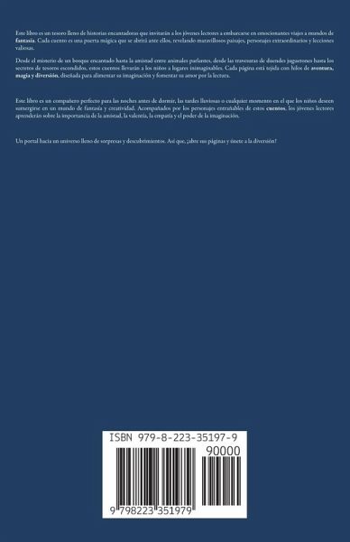Este libro es un tesoro lleno de historias encantadoras que invitarán a los jóvenes lectores a embarcarse en emocionantes viajes a mundos de fantasía. Cada cuento es una puerta mágica que se abrirá ante ellos, revelando maravillosos paisajes, personajes extraordinarios y lecciones valiosas. Desde el misterio de un bosque encantado hasta la amistad entre animales parlantes, desde las travesuras de duendes juguetones hasta los secretos de tesoros escondidos, estos cuentos llevarán a los niños a lugares inimaginables. Cada página está tejida con hilos de aventura, magia y diversión, diseñada para alimentar su imaginación y fomentar su amor por la lectura. Este libro es un compañero perfecto para las noches antes de dormir, las tardes lluviosas o cualquier momento en el que los niños deseen sumergirse en un mundo de fantasía y creatividad. Acompañados por los personajes entrañables de estos cuentos, los jóvenes lectores aprenderán sobre la importancia de la amistad, la valentía, la empatía y el poder de la imaginación. Un portal hacia un universo lleno de sorpresas y descubrimientos. Así que, ¡abre sus páginas y únete a la diversión!