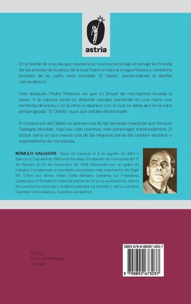 En el borde de una pila que muestra su cuenca seca bajo el ramaje sin fronda de los árboles de la plaza, de la cual fuera ornato si el agua fresca y cantarina brotase de su caño, está sentado "El Diablo" presenciando el desfile carnavalesco. Días después, Pedro Nolasco vio que un tropel de muchachos invadía la plaza. A la cabeza venía un absurdo payaso, portando en una mano una sombrilla diminuta y en la otra un abanico con el cual se daba aire en la cara pintarrajeada. "El Diablo" supo que estaba destronado. El crepúsculo del Diablo es apenas una de las historias maestras que Rómulo Gallegos escribió. Aquí hay más cuentos, más personajes sorprendentes. El lector tiene en sus manos una de las mejores obras del célebre escritor y expresidente de Venezuela.
